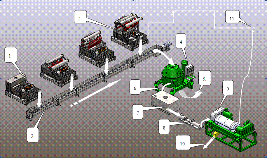 該系統(tǒng)的主要模塊有:GN系列鉆屑干燥機、GN系列高G鉆井液振動篩、GN系列高速變頻鉆井液離心機、螺旋輸送器等。
